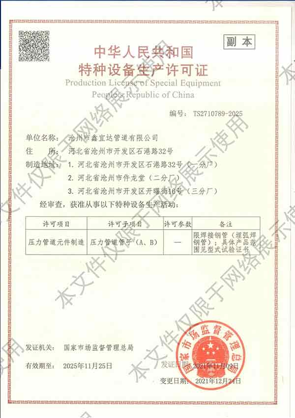 滄州市鑫宜達管道有限公司成立于2003年7月,坐落于滄州經濟開發(fā)區,占地面積40萬平方米,注冊資金1.81億元,是集螺旋鋼管生產、防腐加工以及無縫鋼管、卷板、帶鋼等品類鋼材經營銷售于一體的工貿型企業(yè)。公司現有員工400多人,其中,中高級技術職稱的人員達120余名。 滄州市鑫宜達管道有限公司擁有9條螺旋鋼管生產線和3PE防腐生產線,可生產直徑219--3640mm,壁厚5.5--28mm,最高鋼級X100的各種規(guī)格防腐螺旋鋼管...